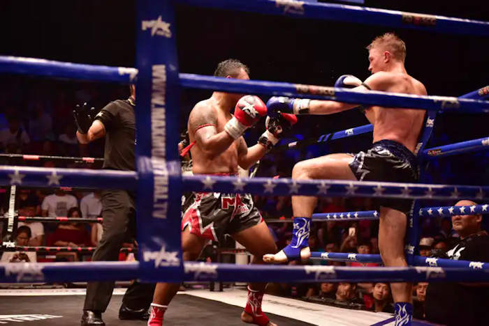 Although he throws in a few kicks Kriss Axelsson fights in a classic Western style. He narrowly wins his fight against a highly skilled Thai opponent who’s record last March stood at 88 wins out of 108 fights with only 15 losses and 5 draws. Kriss is a Swede who moved to Thailand to perfect his Muay Thai skills. He teaches Muay Thai in Koh Samui. From the little we saw of him, it would be difficult not to like this man. It is also hard to fault his boxing style. So why am I calling this video Extreme Muay Thai when I've already done a Double Knockout video from all the first rate action I've witnessed from my front row seat at Pattaya Max Stadium? First off in all 7 fights the action was unrelentingly furious. Secondly these 7 fights produced more than the usual amount of copious blood. Third's the music. My pal, Big Daddy, called the whole scenario here as a disco with a lot of fighting thrown in.