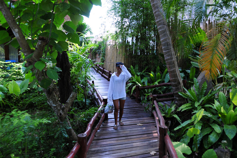 gardens, frog pond, thatched roof outdoor restaurant, and