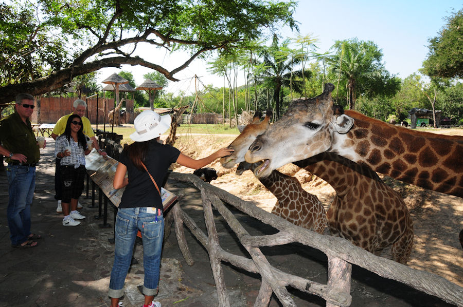 The 2000 acre Khao Kheow Zoo in Sri Racha Thailand just 45 minutes from Pattaya is huge by any reasonable standard of measurement. That's over three square miles which is far too large to walk unless one came to exercise instead of seeing the animals. We rented an extra large golf kart for all five of us. There's 600 different species here and over 8000 animals altogether. Just consider the zoos you've been to back home and ask yourself one question. Does your zoo back home have over 48 species of wild cats? Probably not because the zoos you've already been to probably have just a handful of big cats. Here you will find white tigers, clouded and black leopards as well as the usual lions and Bengal Tigers. At Khao Kheow 40 acres is devoted to the big cats alone. By now you are probably asking, "Is this the famed Tiger Zoo of Sri Racha all the tour groups go to? Absolutely not and you aren't going to find it in the travel brochures either. Although Sri Racha is not a large city there are two zoos here, and despite the Tiger Zoo's excellence, Khao Kheow can only be described by superlatives. It has the second largest aviary in Asia for example so if it's birds you came to see, you can be sure that Khao Kheow eclipses anything you've seen in the U.S. I've lived in Pattaya for over four years before even hearing about it. I don't even think the place has its own web site. But Sri Racha's Tiger zoo does, which means Khao Kheow zoo must be Pattaya's best kept secret. To get there, you will need to book a taxi and make sure the taxi driver isn't taking you to the Tiger Zoo. But sheer size alone is not the only measure of this zoo's overall excellence. The Thais love animals much more than lawyers. In the U.S. the zoos are run for the benefit of the lawyers who are out to make a quick buck because some idiot or another got bitten by a sparrow. And make no mistake, their allies comprise the majority of U.S. population who lie about how much they hate lawyers until the chips are down and Mr. or Mrs. Joe Average is nipped by a chipmunk or spills a hot cup of coffee on himself. Just watch how fast the hypocrite heads to the nearest lawyer once he sees those dollar signs. Compared to the zoos in Thailand American zoos are sterile and boring. And if you don't believe me check the pictures below where you will find us petting and feeding elephants, giraffes, and deer. In one picture you will see my girlfriend within one foot of a hippopotamus, an animal in the wilds of Africa that can and oftentimes does bite people in half. Had she wanted to she might have fed or petted the dangerous animal. As they say in Thailand, it's up to you. To those in the know the animals that are most likely to bite you are the monkeys which are running about loose. There are signs reading, "Do not feed the monkeys". The Thais leave it at that so the choice is yours. There's even a night safari that starts with an early supper. We haven't done that one. Yet. If you are an animal lover or just a nature lover, Pattaya's the place to be. Not only do you have your choice within the same city of two excellent zoos, but there's also the Elephant village on Pattaya's outskirts where you can ride elephants for an hour long jungle excursion, and that's just one of several or more places you can ride elephants. There's elephant shows at Nong Nooch Tropical Garden where audience participation with the elephants is conducted on a scale they'd never allow in Western countries. There's the Crocodile Farm just minutes away from your hotel that's home to thousands of crocodiles. In fact there's hundreds of crocodiles at the Tiger Zoo. So if wildlife is your thing, come to Pattaya because there's a lot more here than what is probably the most hedonistic bar scene on earth.