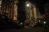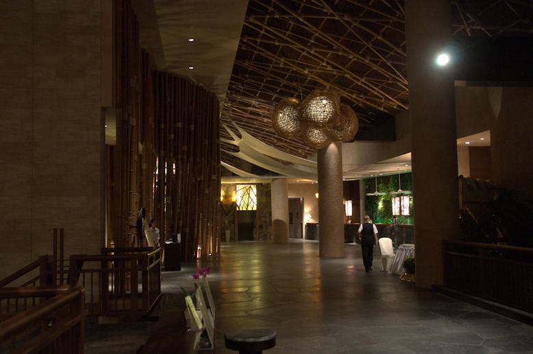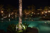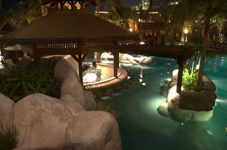 There's a handful of large lighted torches or lamps that with flames lighting up the night that are no doubt powered by natural gas. Looking at them one imagines them lighting up the palace grounds of ancient Greek and Roman cities. There are several more restaurants aside from the ones in the main building. There's one on the South side of the gardens that specializes in Thai and Japanese food. My favorite's the one on the Northwestern corner close to the beach. It's on the second floor. To get there I normally go through the main entry way of the main building, descend the staircase past the waterfall, then I got up a another flight of steps and cross over to the restaurant on one of the suspended walkways. I can see all over the gardens and pools from the little bridge while looking out at the Cove lit up in the night silhouetting the sky to the South.