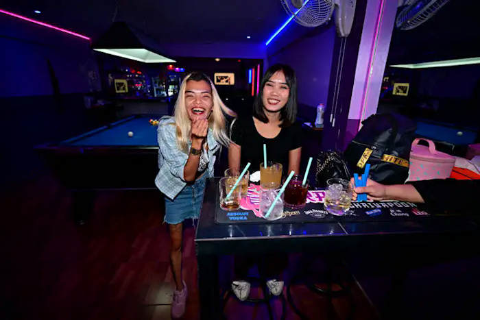 We started out at Sober Bar but only got warmed up there. This is where Koy and Gene met us. But Gene on the wagon. For good I think, so I don't think he wanted to stay with us long. Mali started hitting the tequilas early which turned out to be a big mistake. She was in fine form when we went down the street to Crazy Fox. But it wasn't long after we got to Soi Six that she went to pieces at Smoke and Kisses. So, she never got the change to dexterize Phang.